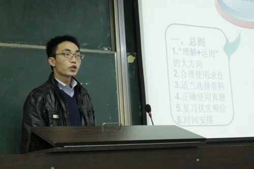 第三个环节是司考高分同学的经验分享。法硕1201班的张淼晶同学和法硕1202班的王鹏鹤同学分别向大家展示了他们顺利突破400分的备战历程。他们各自独特的学习方法和惊人的学习耐力都给同学们留下了深刻的印象,并激起了大家努力和奋发挑战高分的决心。