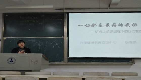 本次讲座张老师围绕压力管理和心理调适这两个方面,着重分析了为何需要压力管理以及如何进行压力管理。首先,张老师从与研究生求职息息相关的小事切入主题,指出当前普遍存在于研究生中的困扰和担忧,比如司考、考公务员以及恋爱问题,让大家明白压力无处不在,自然也会伴随着整个求职过程。