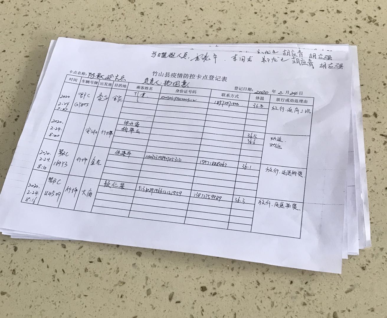 根据市委统一安排,十堰市内村与村之间,组与组之间交通全部隔断,所有进出道路必须封路,限时隔断到位。安河口村这个劝返点是竹坪乡最重要的关口,王莎莎主动要求去这个最关键的地方值守,在防疫卡点主动执勤,对每一个通行的人测量体温、查验通行证,详细登记信息后对符合通行要求的人员才予以放行。