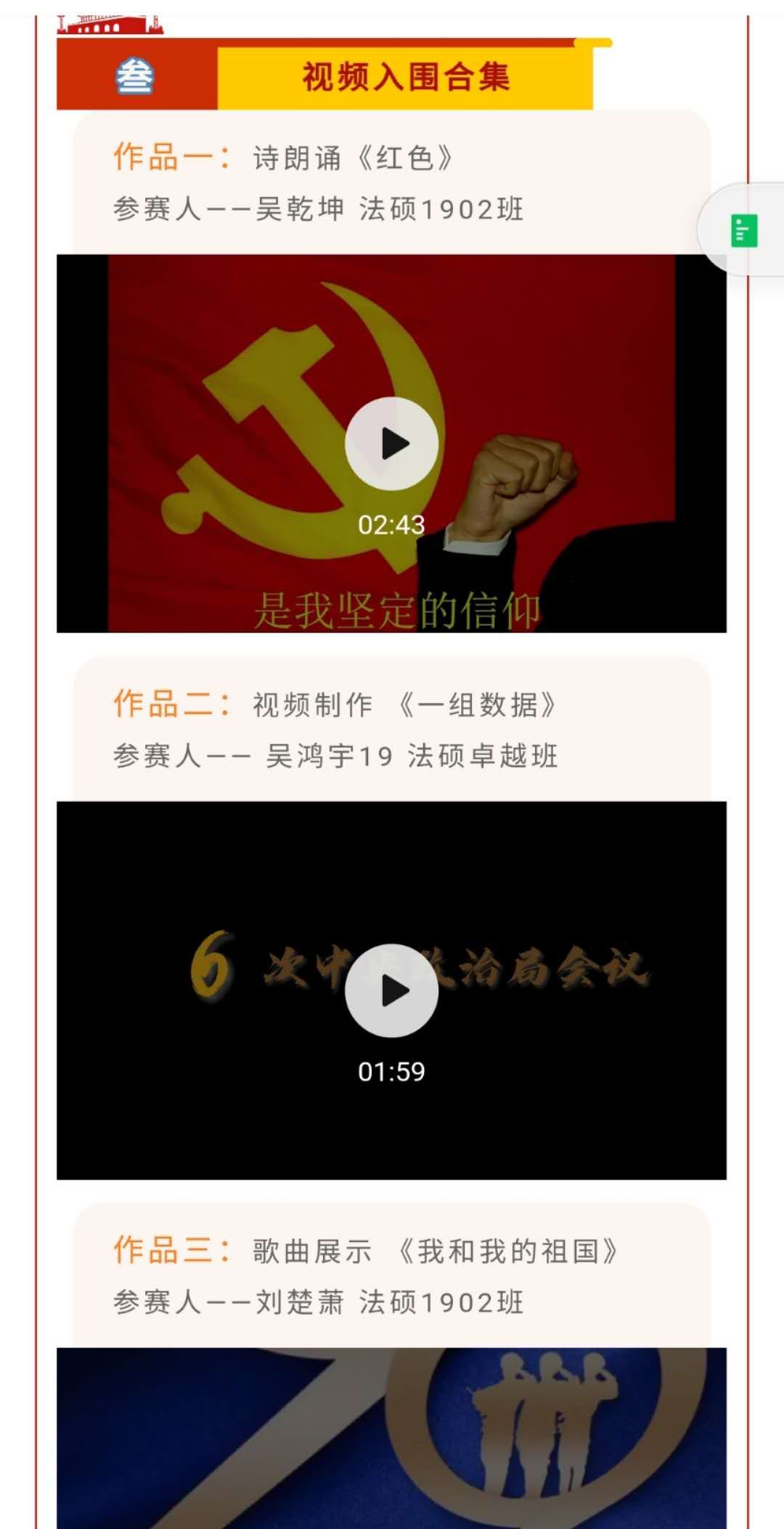 自活动开展以来,法硕学子尽展才艺,为党庆生,以饱满的热情积极参与到活动中来。参赛作品形式多样,但都表达着法硕学子对党的无限深情,一张张旧相片记录着党发展变迁的轨迹,一行行诗句充满着战斗的声音,一声声朗诵诉说着如歌岁月。每一部参赛作品都是一个故事,讲述着党一路走来的坎坷与成就。九十九载岁月,中国共产党是引领中国前进的“领头羊”,大浪淘沙,依旧不忘初心,不负使命,为实现“中国梦”再立新功、再创辉煌。