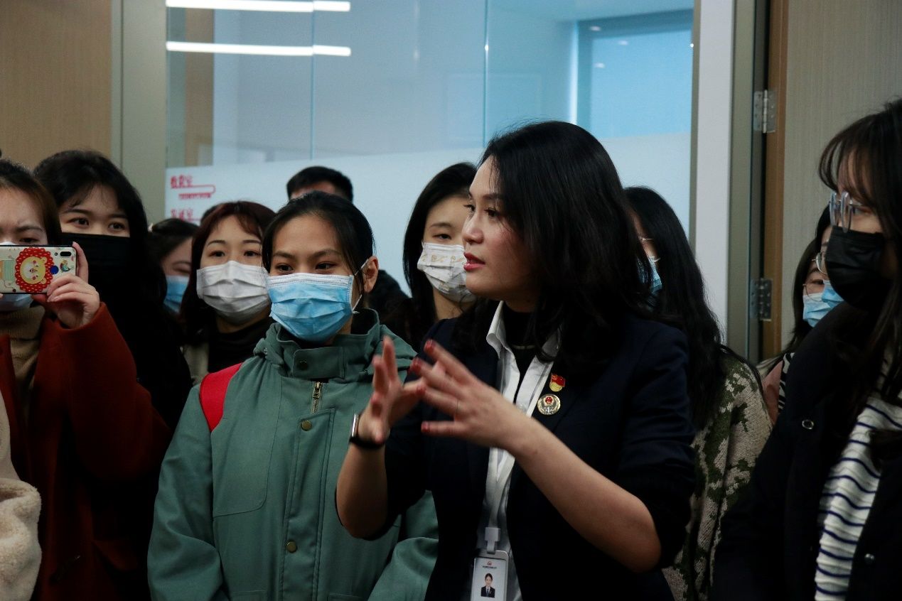 在武汉仲裁委员会国际仲裁院陈迈院长的带领下,同学们参观了武汉仲裁委员会国际仲裁院的办公场所和仲裁庭,亲身感受到了仲裁工作的日常概况;随后在张沫主任的带领下,同学们实地参观了尚信公证处的制证室、音视频采集室、洽谈室、接待室等办公区域,知悉了公证处的日常业务和办公环节;之后在左莹律师的讲解下,同学们对得伟君尚(湖北自贸区武汉片区)律师事务所的办公环境和基本情况有所了解。