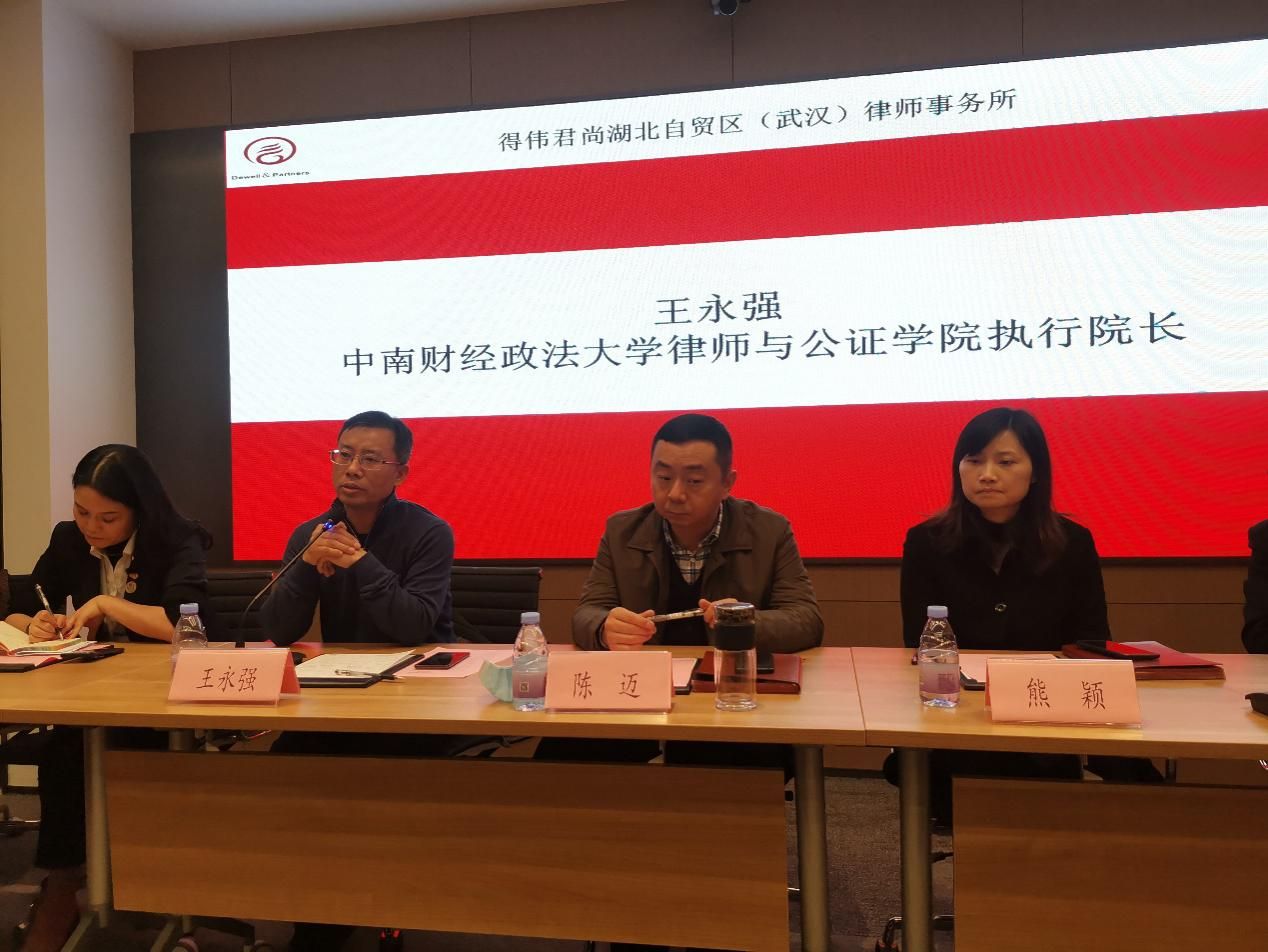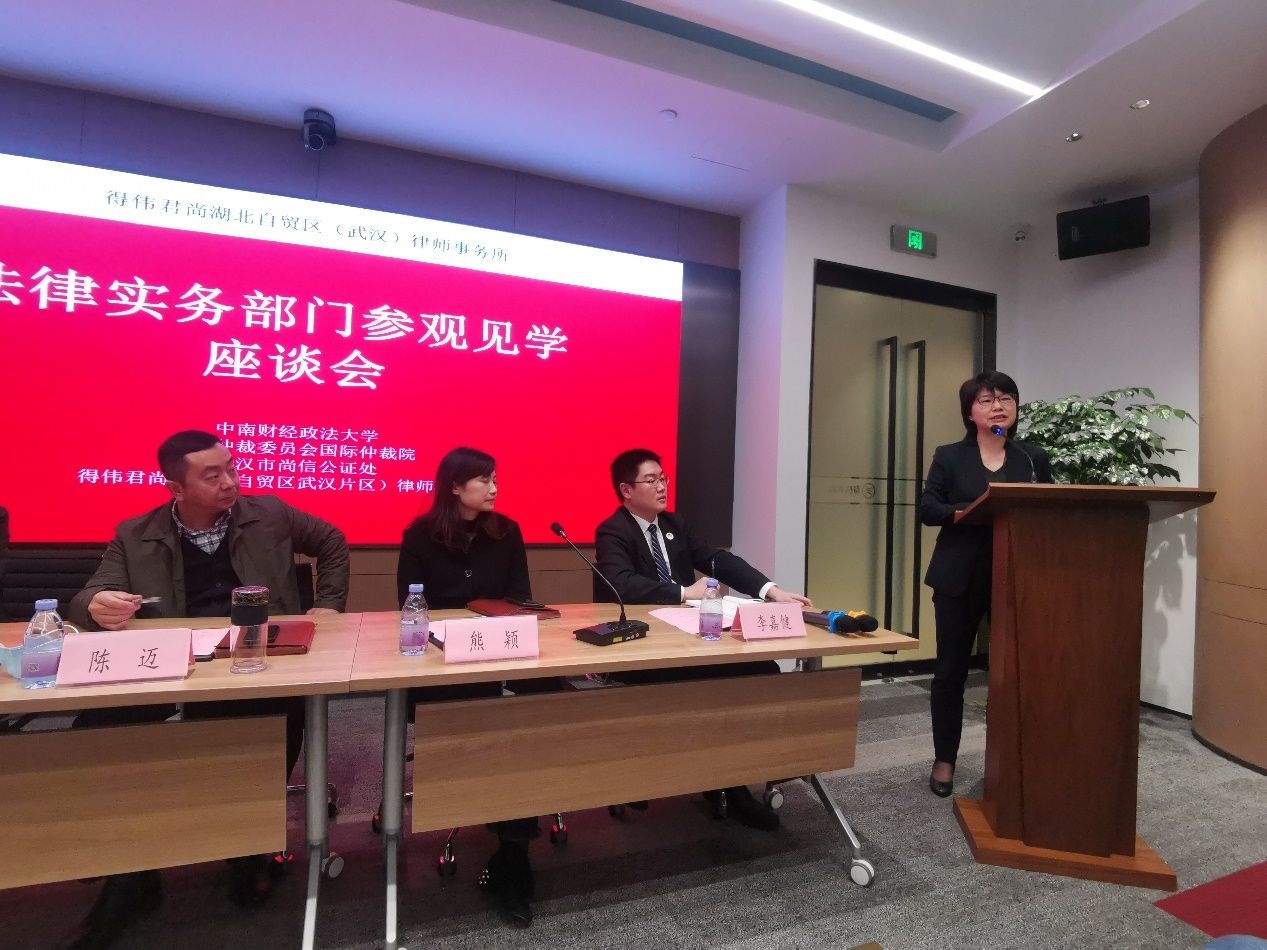 参观见学活动结束后,老师组织同学们在得伟君尚律师事务所的会议室举行了座谈会,律师与公证学院执行院长、法硕导师王永强副教授,武汉仲裁委员会国际仲裁院陈迈院长,武汉仲裁与调解促进会熊颖秘书长,武汉市尚信公证处张沫主任,尚信公证处公证员李嘉健,得伟君尚(湖北自贸区武汉片区)律师事务所副主任、高级合伙人刘松律师作为与会嘉宾参与了本次座谈会。