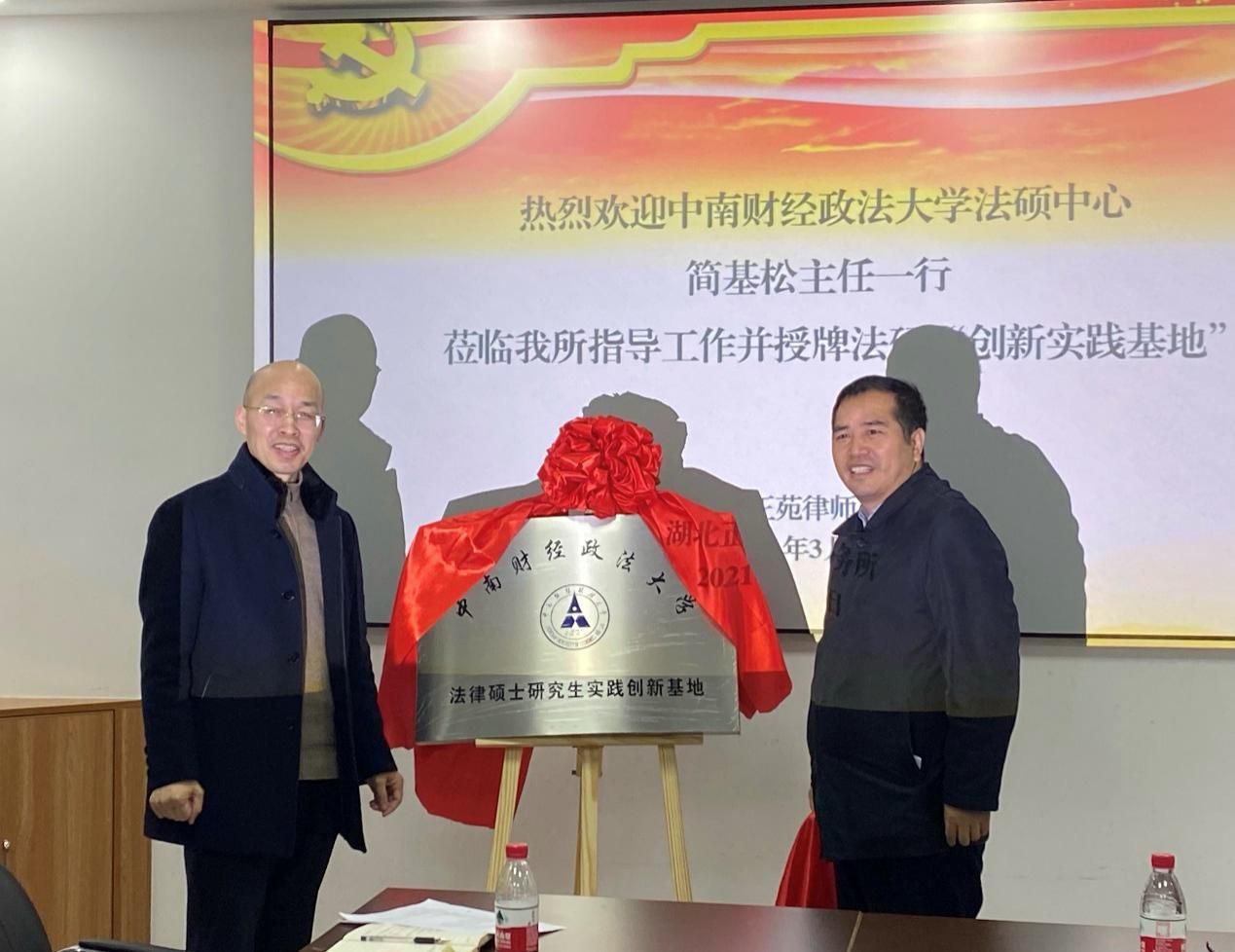 (通讯员 余安琪 摄影 刘翔)2021年3月10日上午10点,“法律硕士研究生实践创新基地”授牌仪式在湖北正苑律师事务所举行。法律硕士教育中心主任简基松教授、法学院陈新副教授、教学秘书杨捷老师、团总支书记刘翔老师、辅导员余安琪老师、湖北正苑律师事务所主任张静雨律师和湖北正苑律师事务所全体职员参加了本次仪式。