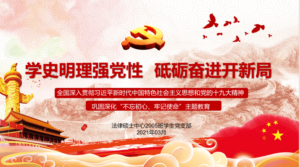 (通讯员 饶李鑫 摄影 李亚琦)2021年3月29日,法律硕士教育中心2005班学生党支部召开了3月份支部主题党日活动,由组织委员张贵鹏同志主持。本次党日活动的主题是“学史明理强党性 砥砺奋进开新局”,主要目标和任务是从党的百年奋斗历程中把握历史规律、汲取真理力量,做马克思主义的忠诚信奉者、坚定实践者,以昂扬姿态奋力开启全面建设社会主义现代化国家新征程,以实际行动和优异成绩庆祝建党100周年。