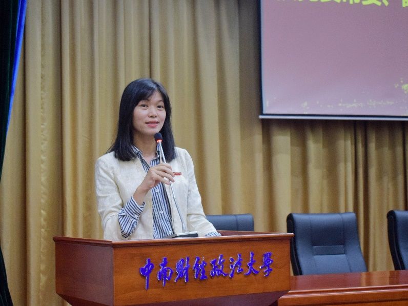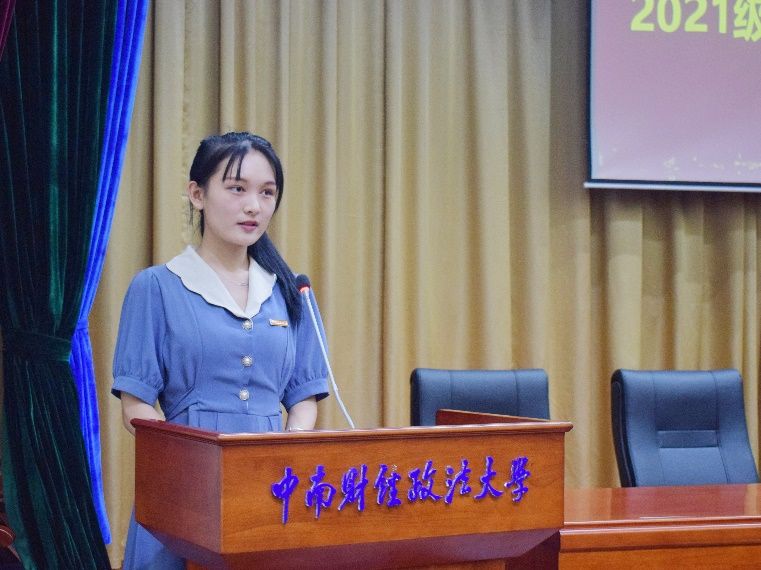 2021级研究生符艺璇代表新生发言。她表达了来到中南大的喜悦和对领导老师们的感谢,并承诺日后一定不断前行,谨记老师教诲,努力成复合型、融通型、创新型、实践型高素质法律人才。