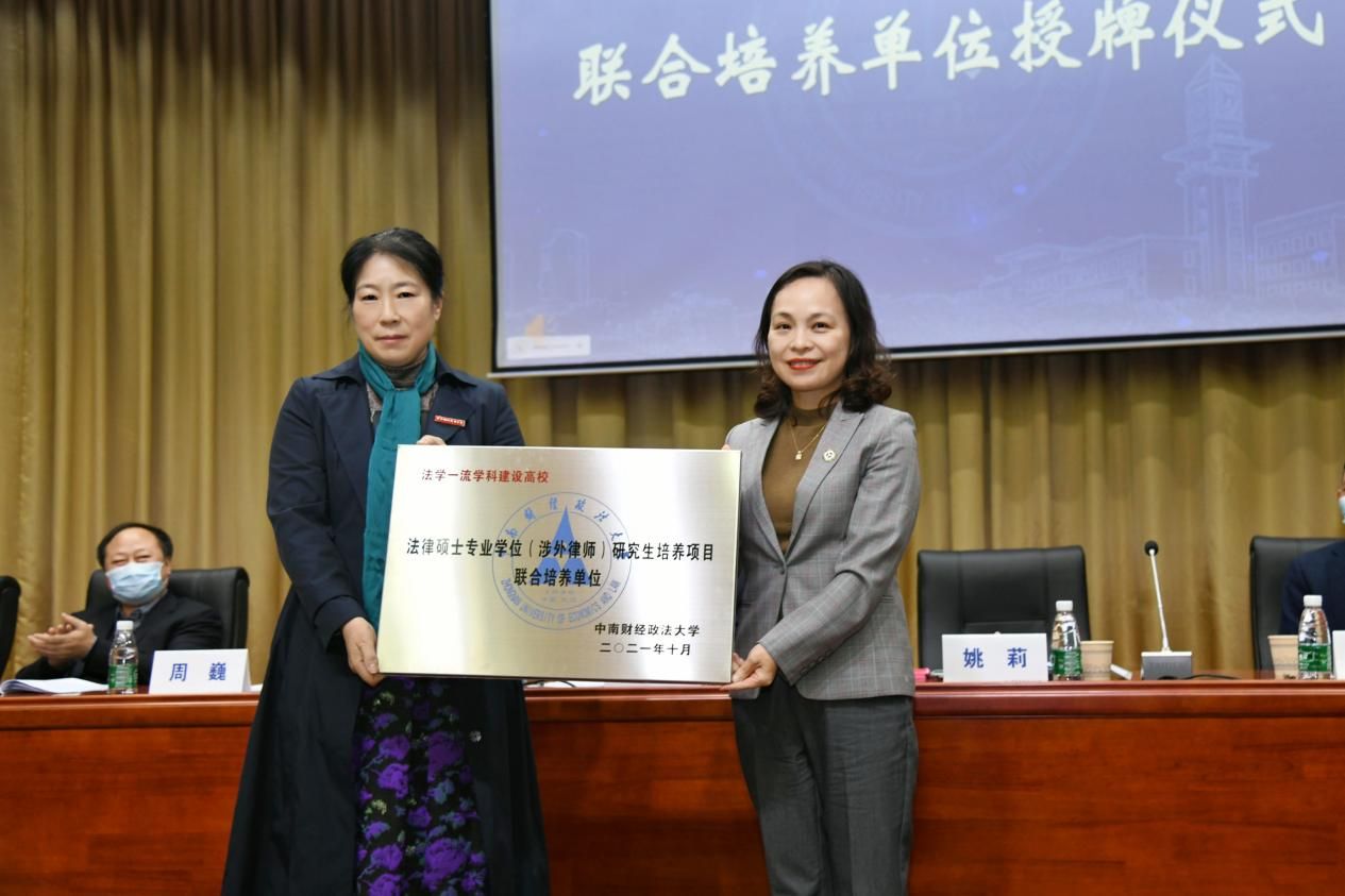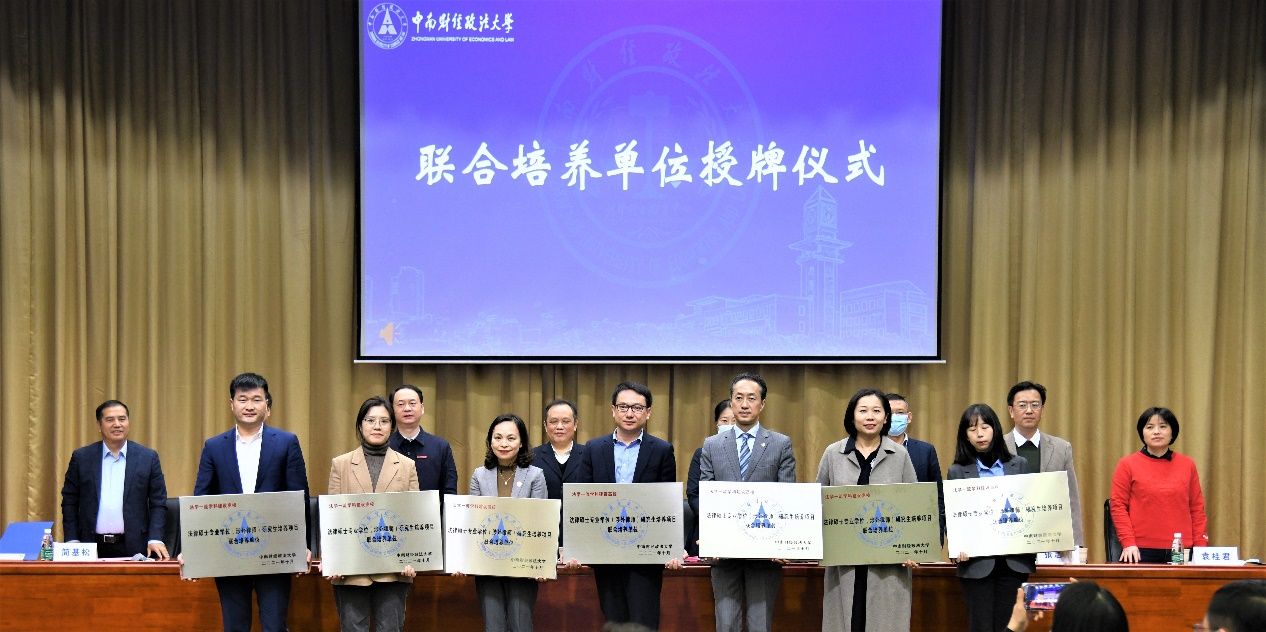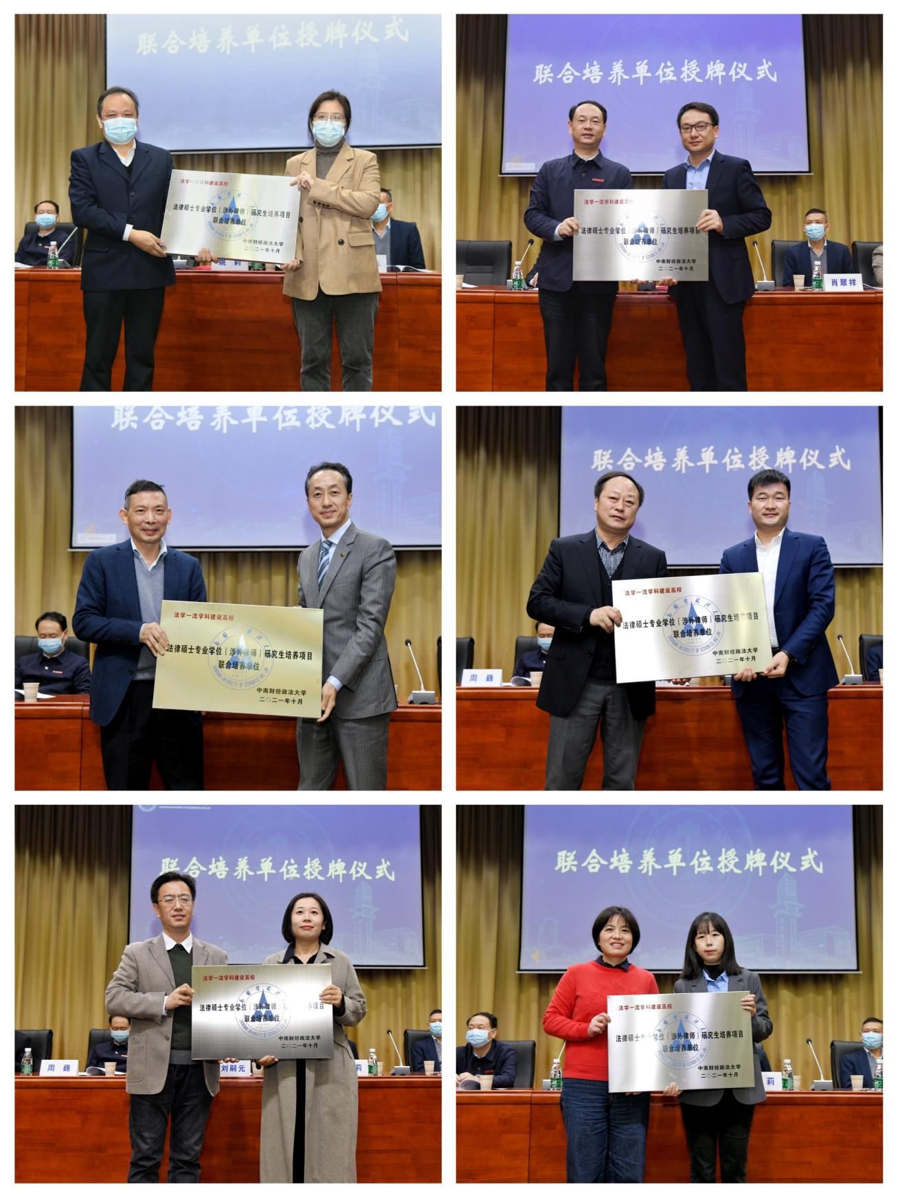 在签约仪式结束后,校党委常委、副校长姚莉、湖北省司法厅副厅长刘嗣元、校党委常委、宣传部部长周巍、党委研究生工作部部长、研究生院副院长肖翠祥、法学院党委书记张学平、刑事司法学院党委书记张志刚和财政税务学院党委书记袁桂君分别为联合培养单位授牌并合影留念。