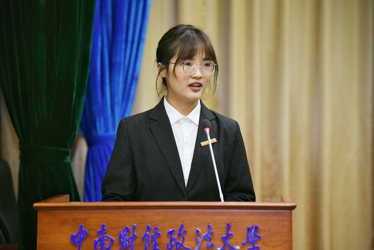 李晚林同学作为学生代表发言。她首先对莅临本次仪式的领导嘉宾和老师同学们表达了由衷的感谢,在回首一路披荆斩棘相聚中南大的难忘历程后,她代表全体同学发出来自心底的声音:定不负时代重托,在追求真理中负重前行,将法律人的担当和奉献铭记于心,把青春与热血融于国家的兴旺与富强!