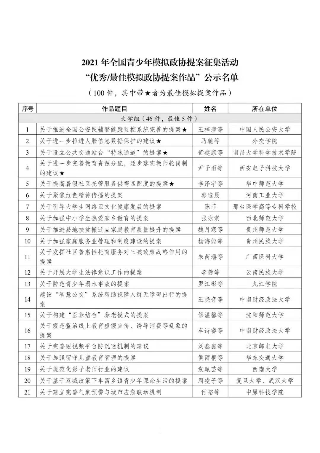 (通讯员 刘翔 王晓奇)2022年1月26日,经过省级团委推荐、团中央初审、专家评审、网络点赞、评审会集体终审等环节,2021年全国青少年模拟政协提案征集活动评审结果出炉。由法律硕士教育中心刘大洪教授和刘翔老师指导,王晓奇、李欣慰、周静、成挚、王书尧提交的《建设“智慧公交”系统帮助盲人无障碍出行的提案》荣获全国“优秀模拟政协提案作品”。