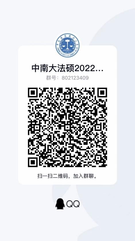欢迎加入中南财经政法大学法律硕士教育中心大家庭。为方便同学们了解法硕中心及专业相关情况,充分做好开学前的准备工作,法律硕士教育中心建立了官方2022级新生QQ群。在这里,会有老师、学长学姐们及时答疑解惑,有关新生工作信息会在这里发布,请同学们务必及时加群(加群时请备注专业+姓名)。