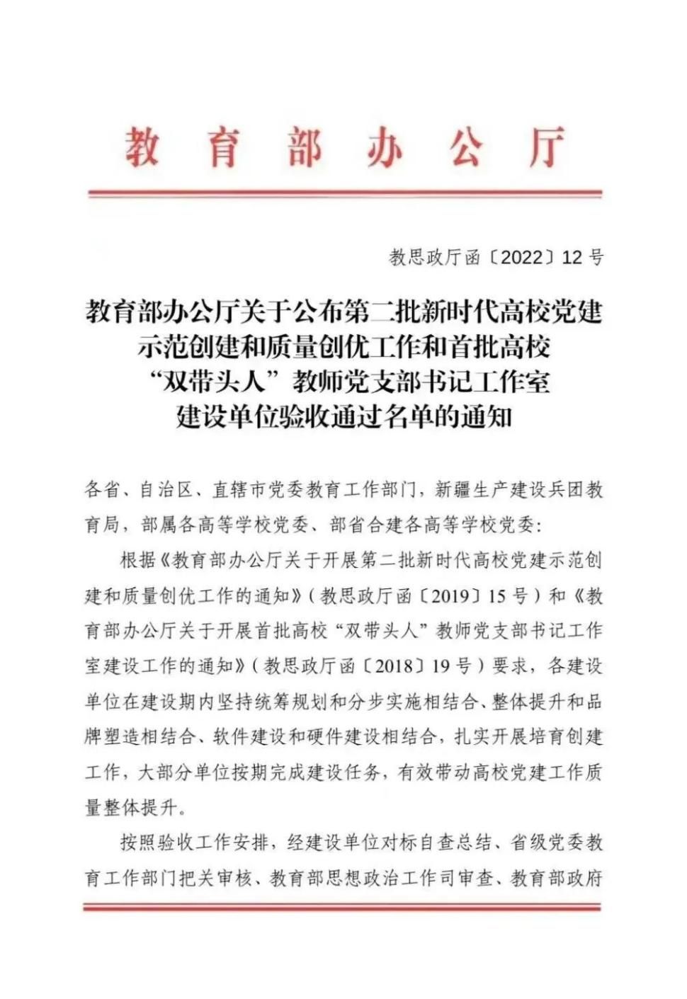 据悉,第二批新时代高校党建示范创建和质量创优工作共遴选10个高校党委、99个院系党组织、999个党支部分别作为全国党建工作示范高校、标杆院系、样板支部培育创建单位。此次,教育部办公厅共认定9个高校党委、98个院系党组织、990个党支部通过验收。首批新时代高校党建示范创建和质量创优工作延长建设期的1个院系党组织、1个党支部经二次验收,予以通过。