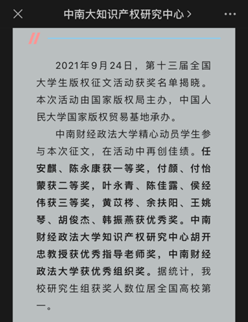 国家奖学金、学业奖学金一等奖、优秀研究生、全国大学生版权征文大赛二等奖,全国大学生英语竞赛一等奖、华中高校研究生笔译大赛一等奖。