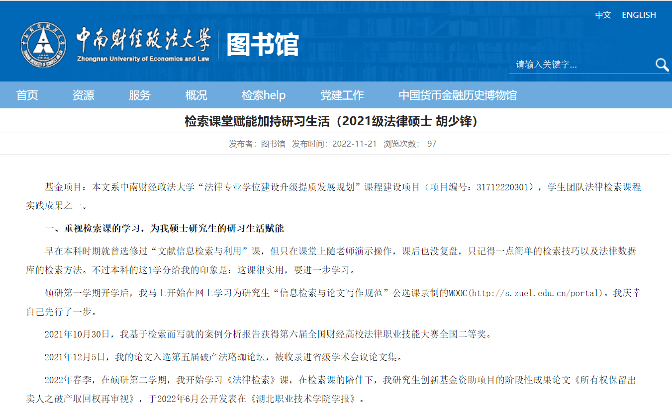 胡少锋认为当撰写论文和分析案例成为研究生阶段研习的重要内容,文献信息检索的重要性就逐渐凸显。熟练进行法律检索,可以使得写作事半功倍。无论是先期的写作方向还是后续写作的论证方式,他认为都可以通过法律检索来确定。有了法律检索的基础,胡少锋的课程论文均取得优良成绩。他曾在法律检索课堂展示中说:“学术研究建立在文献之上,检索技能是一名合格研究生的必备技能,此次法律检索的课堂让我对各种检索技巧和常用数据库有了更加全面的了解,提升了我的学术研究能力。”