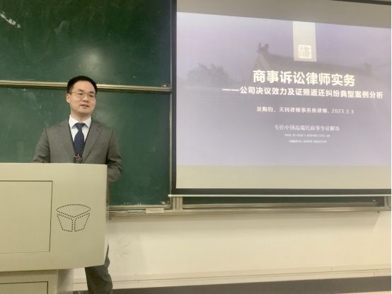 (通讯员 旷涵潇 许晴)为深入贯彻《专业学位研究生教育发展方案(2020-2025)》,持续推动产学研协同育人体系建设,提高法律硕士人才培养质量,提升法律硕士专业学位(金融法律与实务)研究生培养方向学生的专业与实务能力,法律硕士教育中心和法学院经济法学系于2023年3月3日邀请北京银行法学研究会副秘书长、北京市天同律师事务所吴陶钧律师来到“企业法原理与实务”课堂开展专题讲座。本次授课在文添楼316教室进行,主题为“商事诉讼律师实务——公司决议效力及证照返还纠纷典型案例分析”。法律硕士教育中心王广波副主任、教学秘书杨捷老师,法学院经济法学系侯卓教授、旷涵潇老师,以及“金融法律与实务”等方向的法律硕士研究生和本科生共计三十余人参加本次讲座。