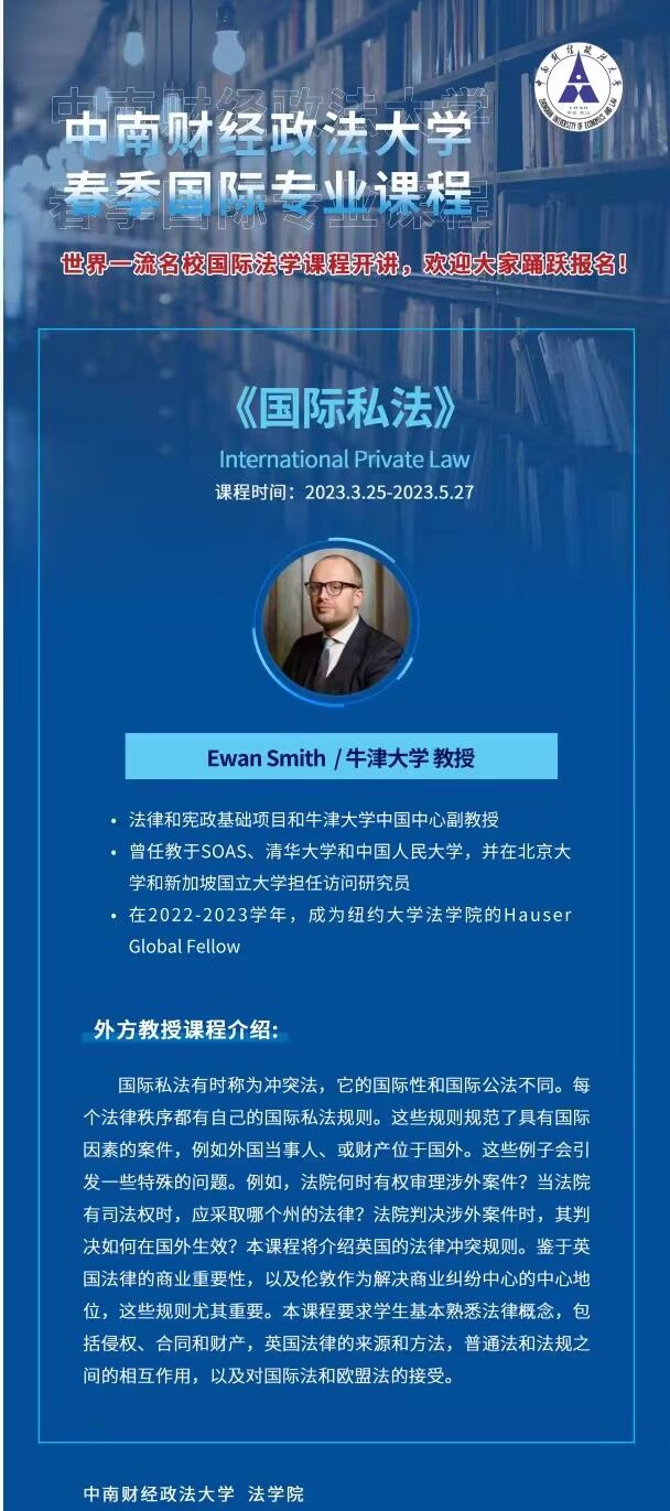 “全球治理与国际组织法治青年人才培养计划”第二期邀请了来自于牛津大学的外籍教授Ewan Smith教授将于2023年3月25日--5月27日线上为中南财经政法大学法学专业学生开展全英文授课。本次授课采用“中教+外教”联合授课、“线上教学+线下辅导”的创新型教学模式。本次授课中方导师为法学院国际法系丁汉韬老师。