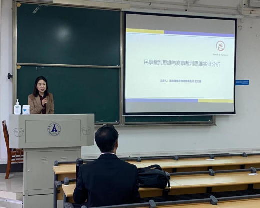 (通讯员 朱未末 安瑜)为深入贯彻《关于加强新时代法学教育和法学理论研究的意见》《专业学位研究生教育发展方案(2020-2025)》,持续推动产学研协同育人体系建设,提高法律硕士人才培养质量,提升法律硕士专业学位研究生的专业与实务能力,法律硕士教育中心于2023年4月13日邀请得伟君尚高级合伙人石文娟律师来到“商法专题”课堂开展实务授课。本次授课在文添楼308教室进行,主题为“民事裁判思维与商事裁判思维实证分析”。授课由法律硕士专业学位(企业破产并购)导师组副组长王永强副教授主持。