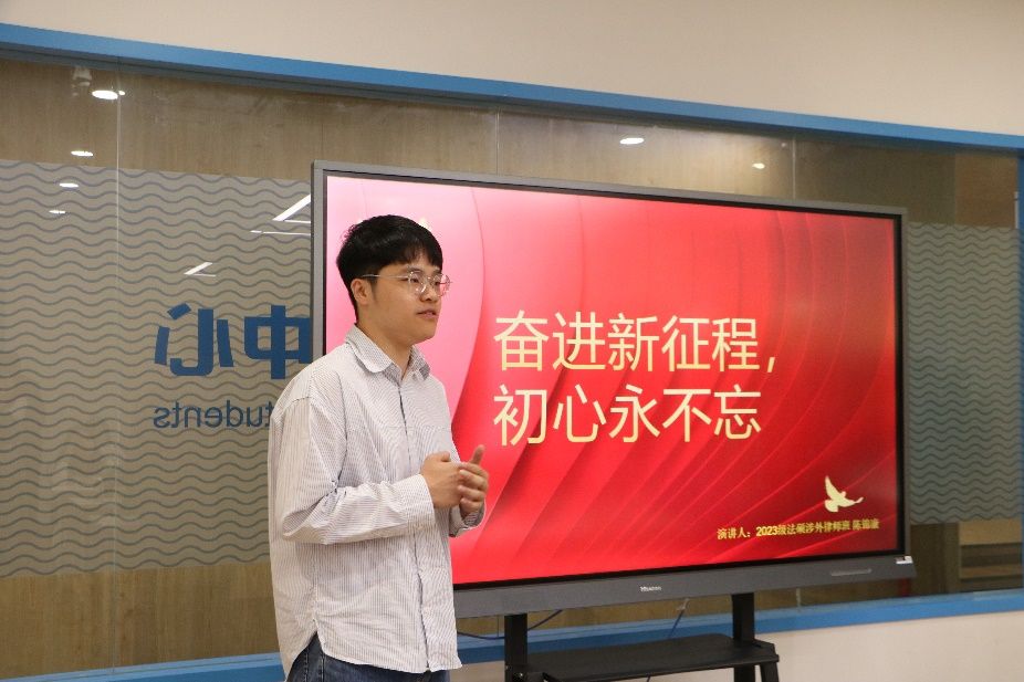 第三位选手是来自2023级涉外律师班的陈锦康,他的主题是“奋进新征程,初心永不忘”。讲述了新时代的中国青年要以实现中华民族伟大复兴为己任,增强做中国人的志气骨 气底气,不负时代,不负韶华,不负党和人民的殷切期望。