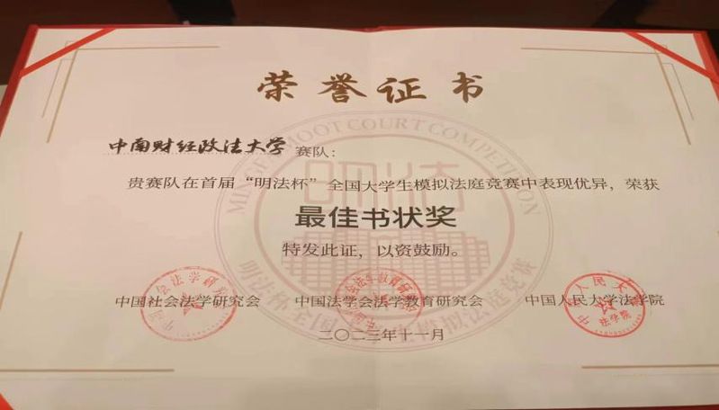 (通讯员 周诗琪 姚迪祯妮)11月4日至6日,中国人民大学法学院主办的首届“明法杯”全国大学生模拟法庭竞赛在北京成功举办。我校代表队以原被告双方书状均是第一名的成绩荣获“最佳书状奖”。