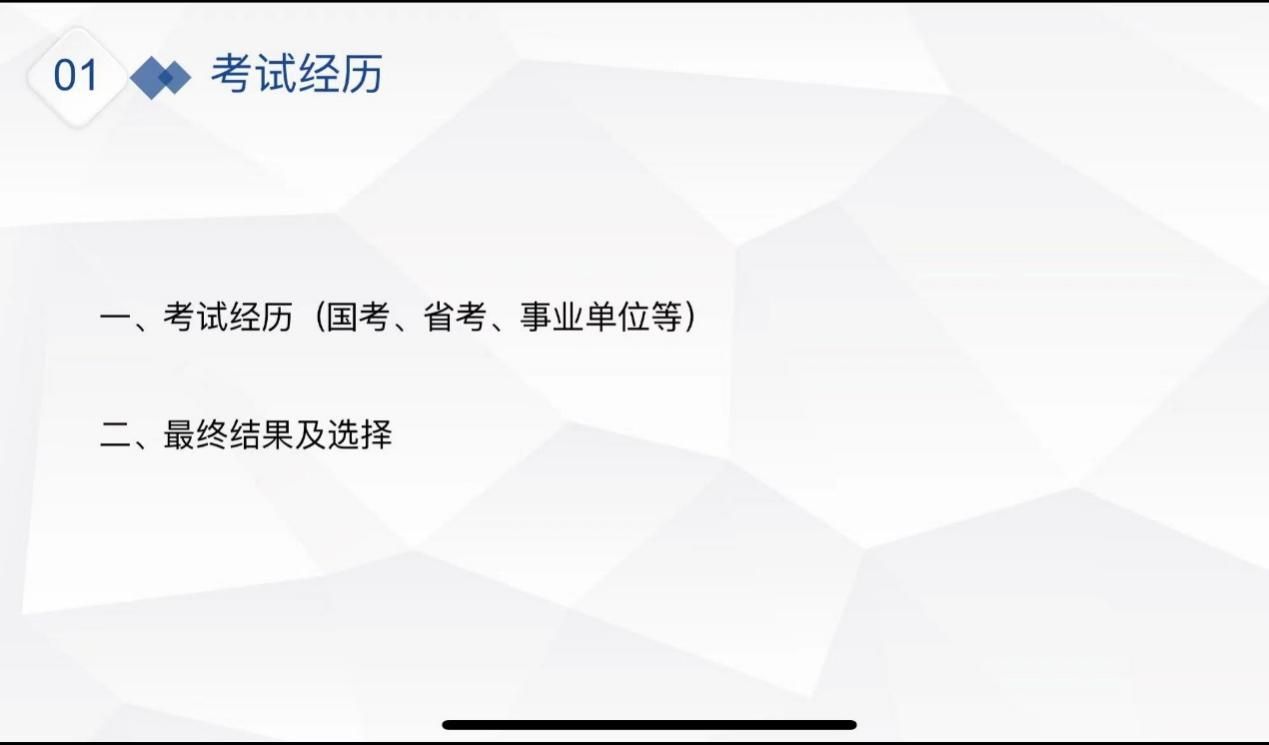 在分享、介绍备考经验前,张银银重点介绍了定向选调与普通选调在职业发展前景方面的区别,并叮嘱同学们提前关注官方信息,做好时间安排,在时间允许的情况下多参加考试。针对具体的岗位选择,张银银认为需要考虑离家距离、薪酬待遇和工作内容三个因素。