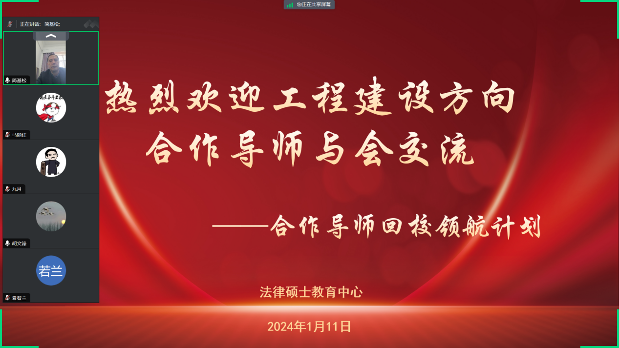 (通讯员 周诗琪 陈璇 学生通讯员 黄文杰 米亚铭)为深入贯彻落实习近平总书记关于研究生教育工作的重要指示和教育部《关于深入推进学术学位与专业学位研究生教育分类发展的意见》文件精神,落实“双导师制”,全面提升法律硕士拔尖创新人才自主培养质量,法律硕士教育中心于1月11日下午采用线上腾讯会议的方式召开第七场“合作导师回校领航计划”工程建设法律与实务方向专场合作导师与研究生见面会。法律硕士教育中心主任简基松,副主任王广波,教学秘书杨捷、陈璇,2023级专职辅导员周诗琪,上海建纬(武汉)律师事务所主任张志文、行政总监张海涛,上海市建纬(南京)律师事务所主任孙宁连,上海市建纬律师事务所副主任韩如波、宋仲春,合伙人陈军、蒋烽、刘畅,中铁大桥局集团有限公司调研员、原总法律顾问马建国,法律合规部部长胡文锋,中国能源建设集团有限公司总经理秦铁平,中冶南方工程技术有限公司法律事务部部长郑洁,武汉城市建设集团有限公司总法律顾问李芊,北京德和衡律师事务所集团副总裁马丽红等参加本次见面会。会议由王广波主持。
