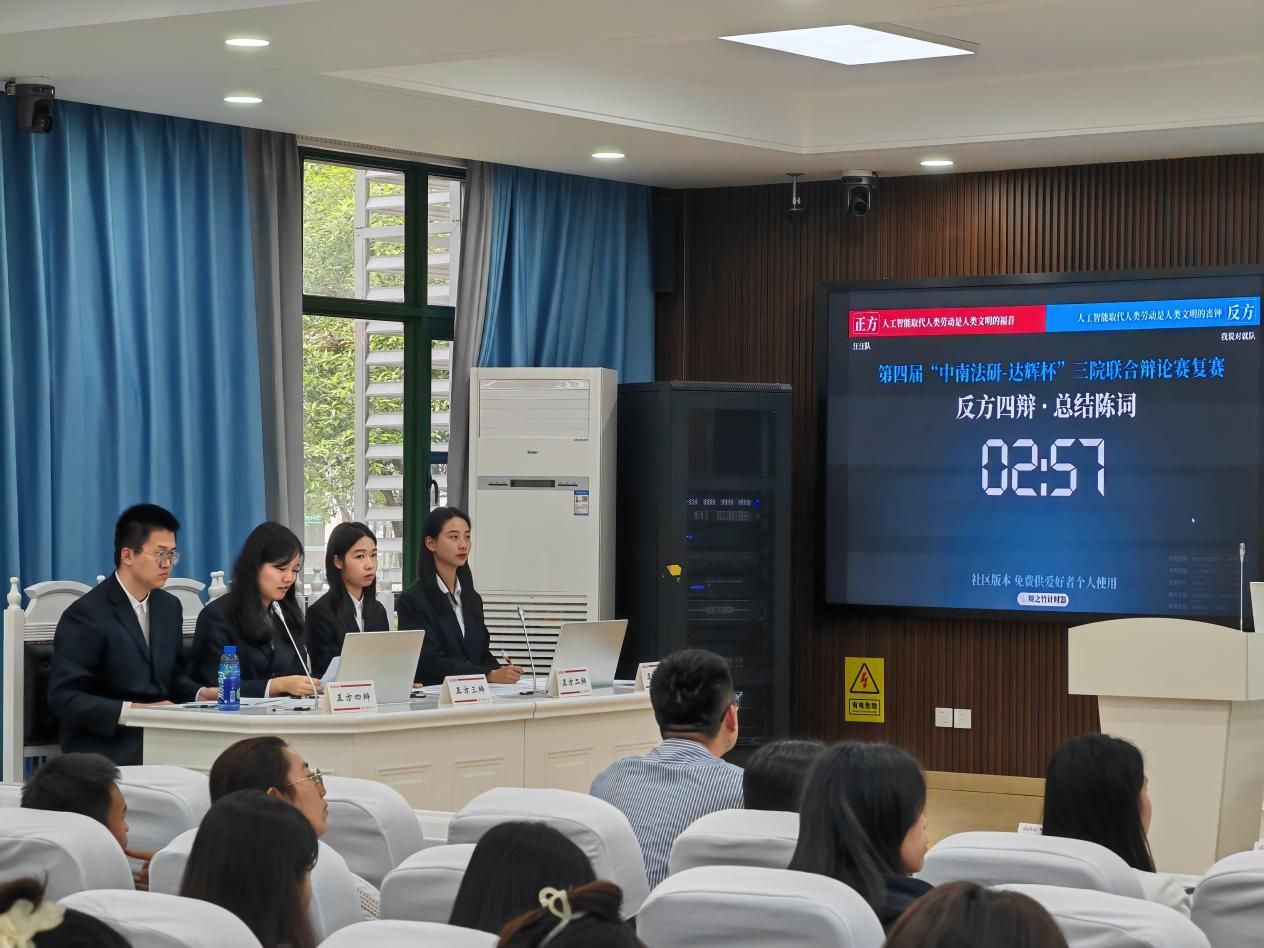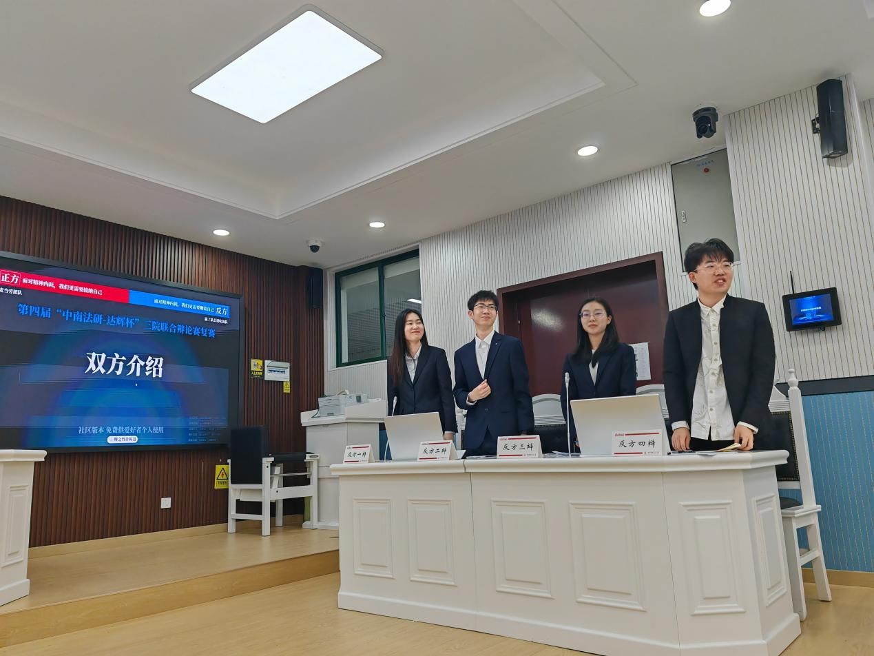 (通讯员 陈庆瑶 王济安 摄影 王嘉宁)为锻炼同学们的逻辑思维,发扬思辩精神,丰富全校辩论文化,4月18日下午,由中南财经政法大学法学院研究生会主办、法律硕士教育中心研究生会、刑事司法学院研究生会与达辉律师事务所协办的第四届“中南法研——达辉杯”三院联合辩论赛复赛在文泰楼模拟法庭二顺利举办。本次辩论赛复赛邀请到达辉律师事务所陈奕竹、中南财经政法大学法学院副教授陈晓敏、刑事司法学院副教授王复春、法学院梁佳欣老师担任评委,比赛由付雅睿主持。