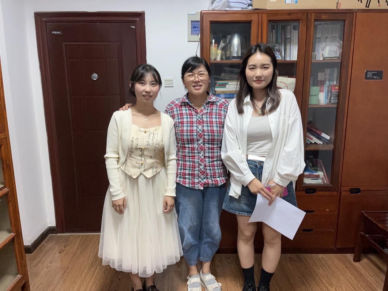 尹生老师(中)与采访记者2023级法律硕士研究生张薇(左)、2023级法律硕士研究生杨益珍(右)合影
