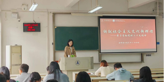 余安琪老师以“铸就社会主义文化新辉煌——学习贯彻党的二十大精神”为题,围绕党的二十大精神展开论述,敦促同学们要学好学深、悟透悟实党的二十大精神,并以社会主义文化为切入点,带领同学们观看了中华文明专题视频,增强了同学们的文化自信。