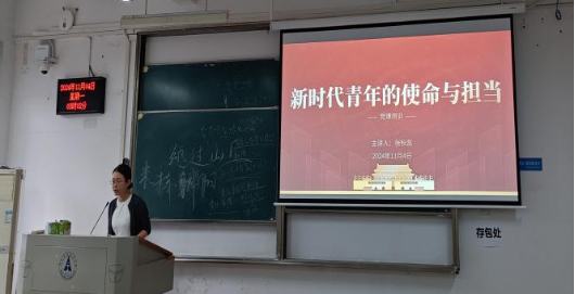 张秋蕊老师以“新时代青年的使命与担当”为题,阐述了青年在国家发展和社会进步中的重要角色。她鼓励广大青年积极投身于国家建设,勇于创新,敢于担当,坚定听党话、跟党走的理想信念,永葆肯吃苦、不怕苦的奋斗精神。